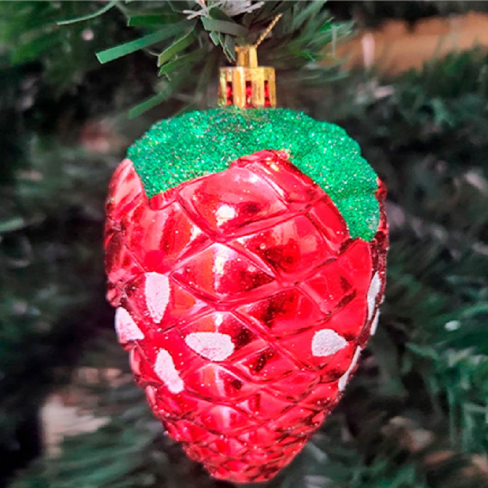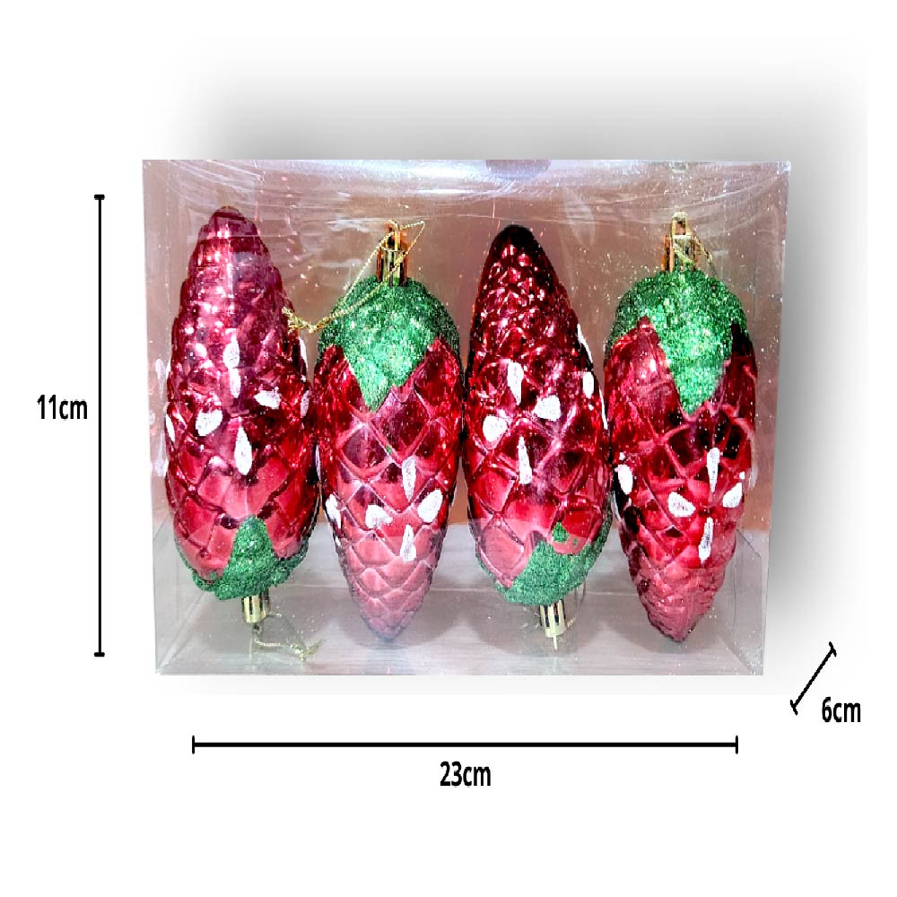 Hermoso set de 4 adornos en forma de piña navideña, con acabado brillante en tonos rojo y verde con detalles en glitter.