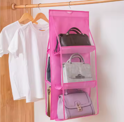 - Este organizador de bolso de mano para armario cuenta con ranuras de plástico transparente que permiten una fácil identificación del contenido.