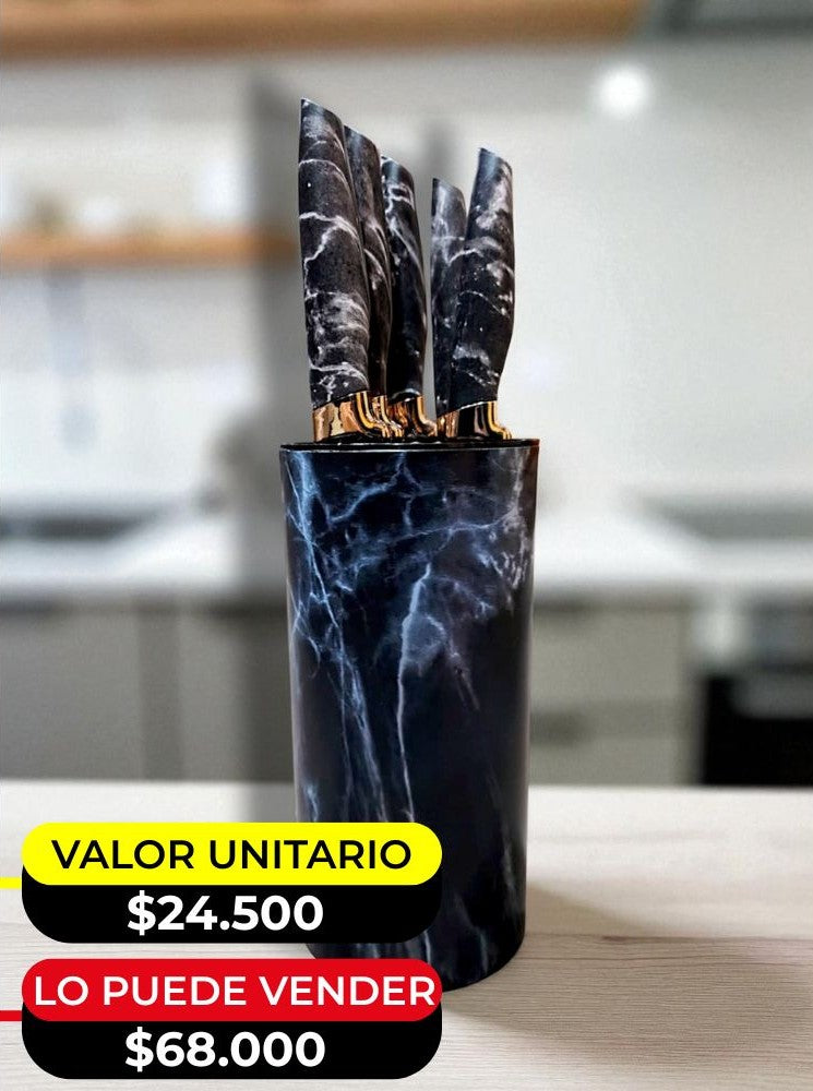 Dale un toque de lujo a tus preparaciones con este set de cuchillos de 5 piezas con recubrimiento cerámico, diseñados para brindar durabilidad, filo superior y un acabado sofisticado estilo mármol.