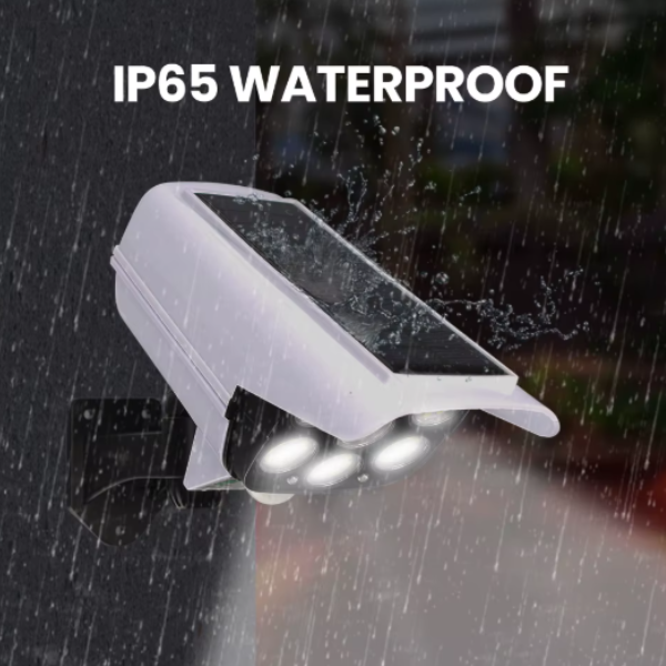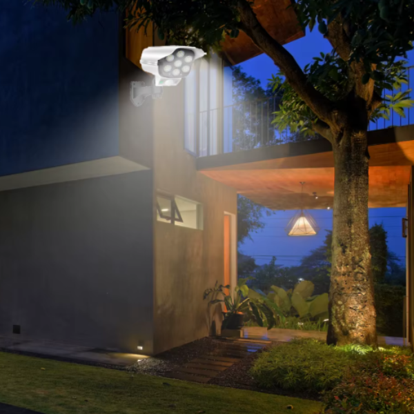 Esta luz solar con forma de cámara de seguridad disuade a los intrusos mientras brinda iluminación automática. Recargable con energía solar y control remoto incluido. ¡Ideal para exteriores, sin cables ni complicaciones!