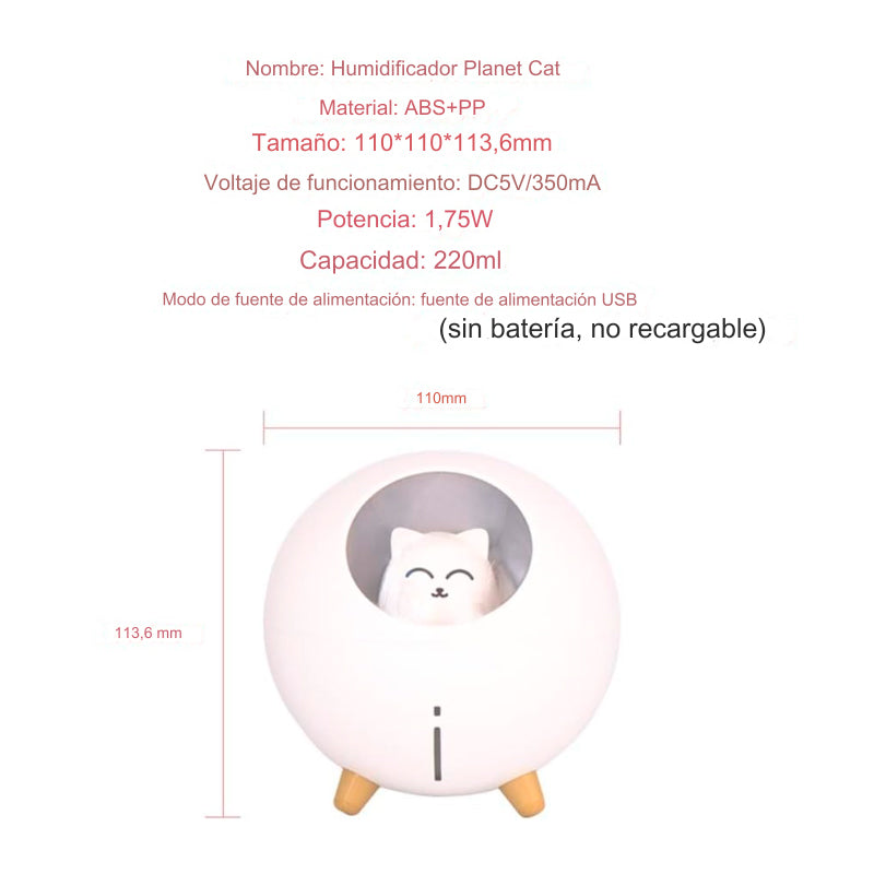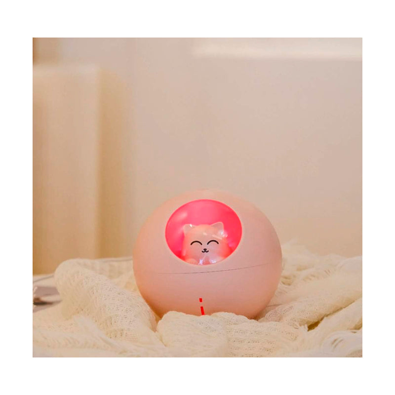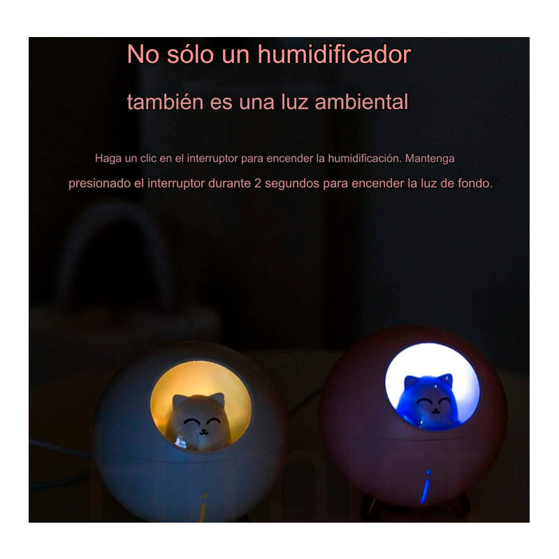 Su diseño en forma de esfera con un gatito sonriente no solo decora, sino que también libera una suave bruma que mejora el ambiente, hidrata el aire y brinda una sensación de frescura y bienestar.
