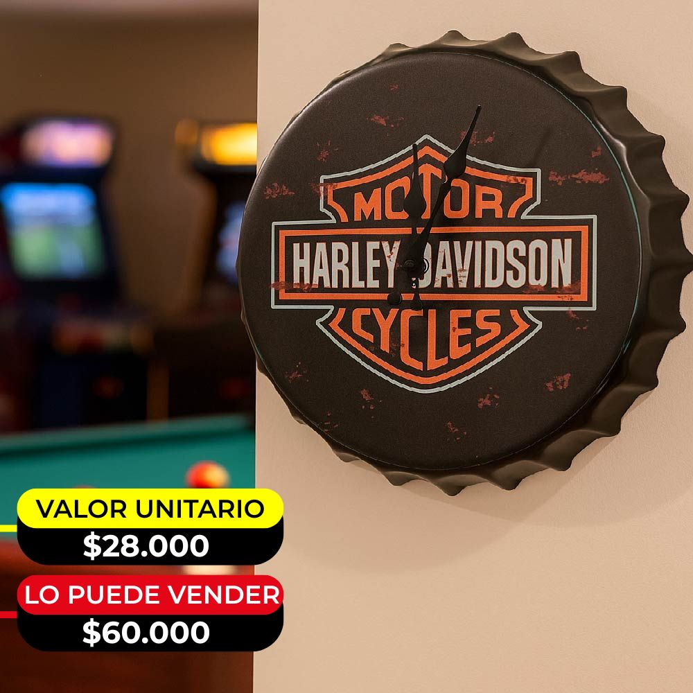 Reloj metálico en forma de tapa de botella con diseño vintage Harley-Davidson. Perfecto para bares, salas, oficinas o para los amantes de las motos. Un detalle retro que combina funcionalidad y decoración en un solo accesorio. 🚲🔥